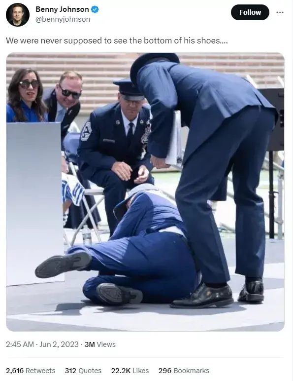 Первым об этом инциденте написал журналист Бенни Джонсон. По его словам, американцы никогда не должны были увидеть подошву ботинок президента. Комментаторы тут же подметили необычные каблуки и смеющихся над падением Байдена людей.