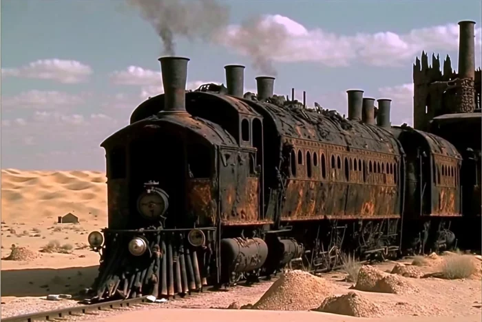 Паровоз из первой части «Гарри Поттера» нейросеть нарисовала в виде ржавого поезда, который покрыт смолой и грязью.